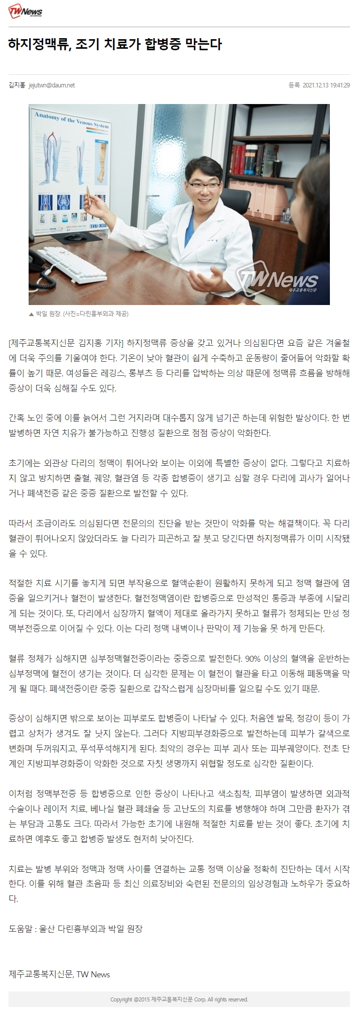 [제주교통복지신문]하지정맥류, 조기 치료가 합병증 막는다