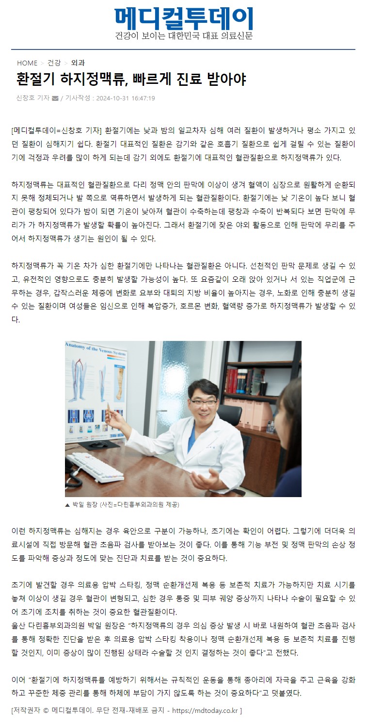 [메디컬투데이] 환절기 하지정맥류, 빠르게 진료 받아야 페이지 정보 작성자 다린흉부외과 댓글 0건 조회 789회 작성일 24-11-14 15:56 목록 본문 저작권자 © 메디컬투데이 무단전재 및 재배포 금지 댓글 0 댓글목록 등록된 댓글이 없습니다. 다음글[미디어파인 하지정맥류, 조기 진단 및 예방이 우선되어야 24.08.30